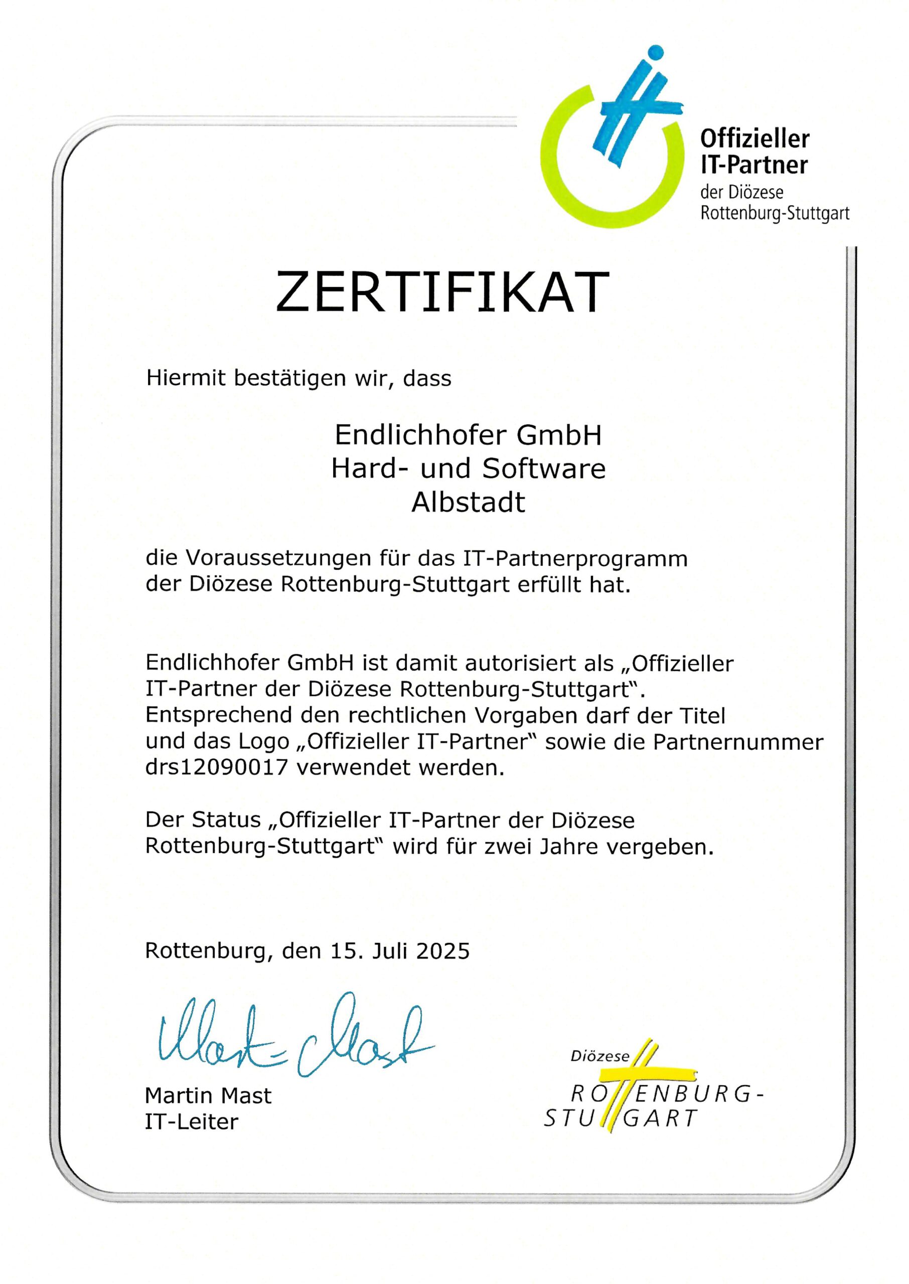 Mit der Einführung des IT-Partnerprogramms der Diözese Rottenburg-Stuttgart haben wir uns zertifizieren lassen. Seit dem 08. Januar 2013 sind wird dadurch offizieller IT-Partner der Diözese Rottenburg-Stuttgart.